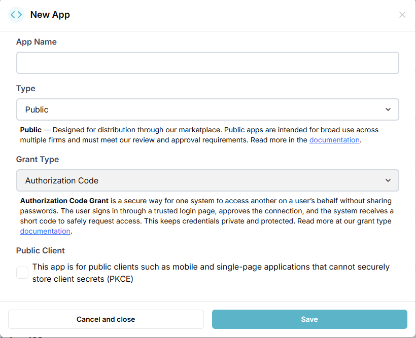 | Private App | Partners & Firms | Not listed on marketplace for internal use by a single firm | Authorization Code Grant or Client Credentials Grant |