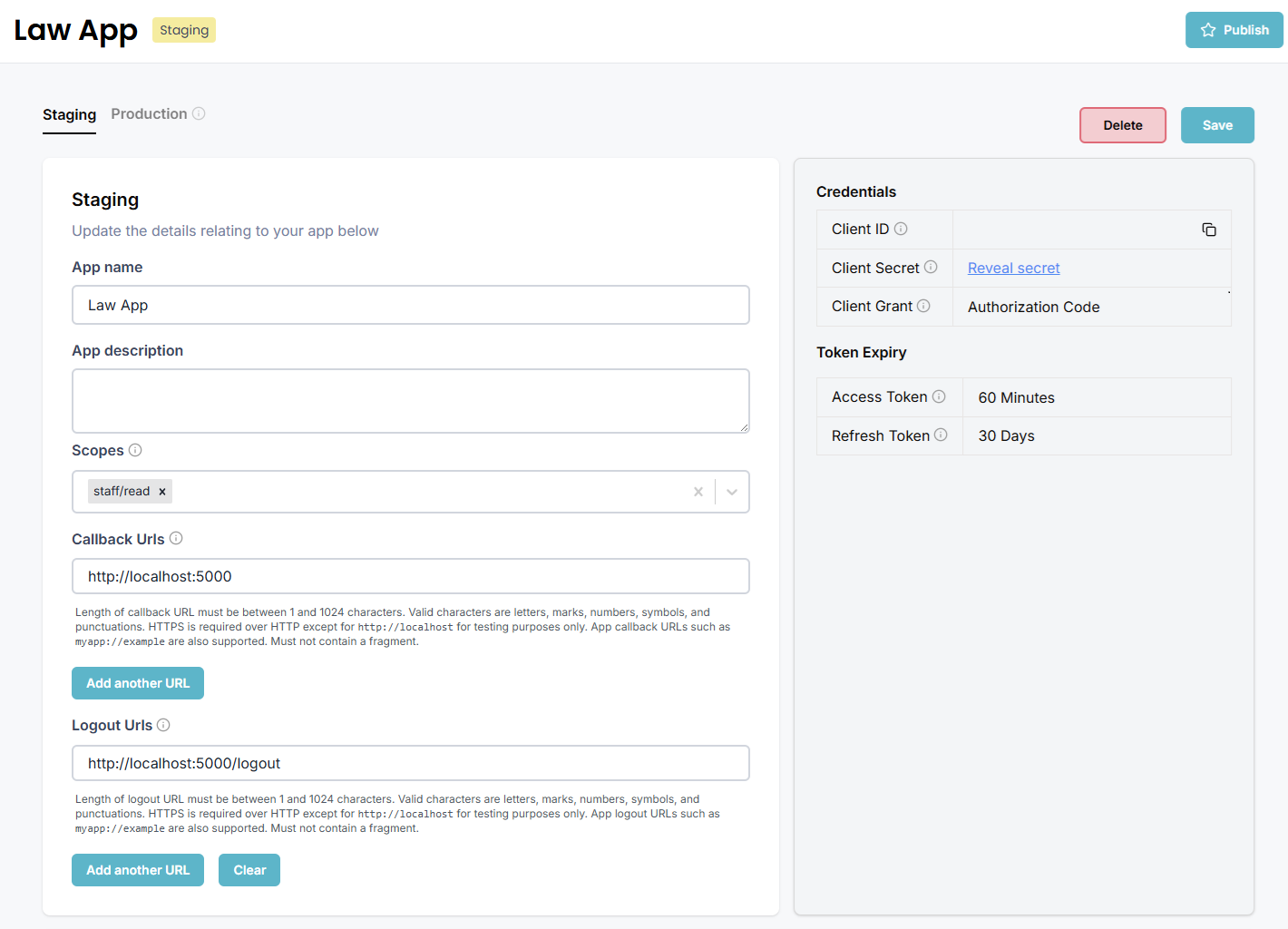 You can switch between the Staging and Production environments to access different configurations of your app using the tabs above your app details.Partners developing applications for multiple firms must go through our staging environment and security review process before accessing production.Firms building custom applications for their own use have direct access to the production environment.